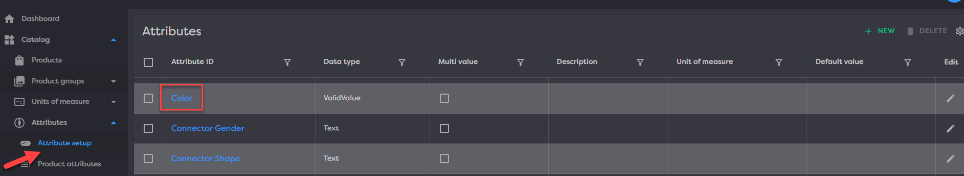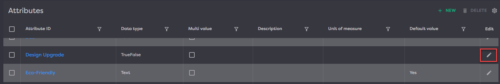 Attribute setups can also be edited by clicking the pencil icon in the “Edit” column. Most properties can be edited besides the attribute ids and data types which can only be specified on create.