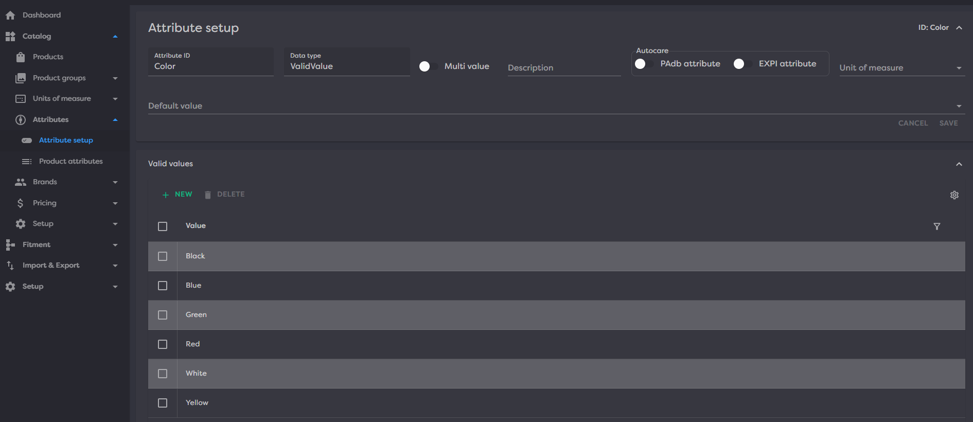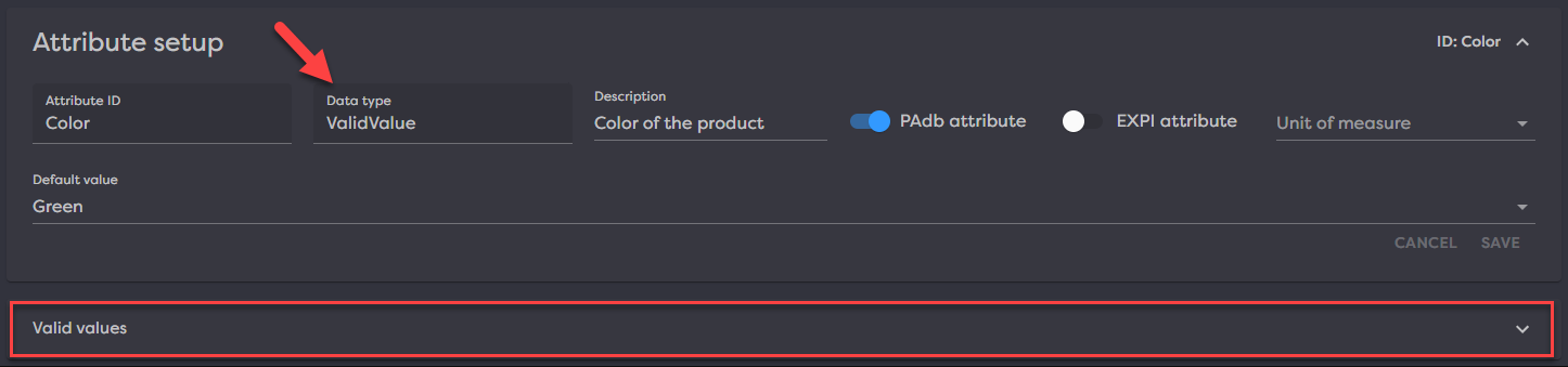 One of the data types supported in Product Desk is Valid Values. Valid Values describes a data type in which attribute values can only be populated via the value from a user defined list. Valid values can be defined in Product Desk by going to the attribute setup details. If the valid value data type has been selected a grid will appear in a "Valid values" expansion panel.