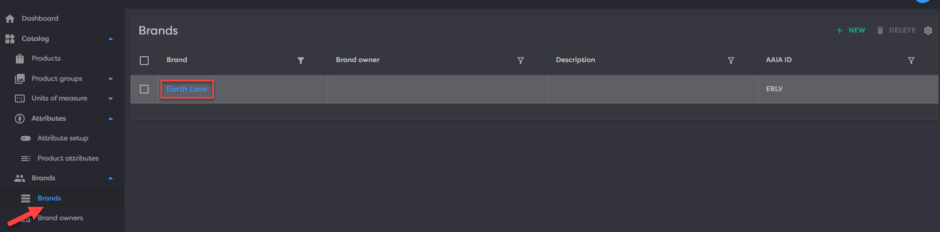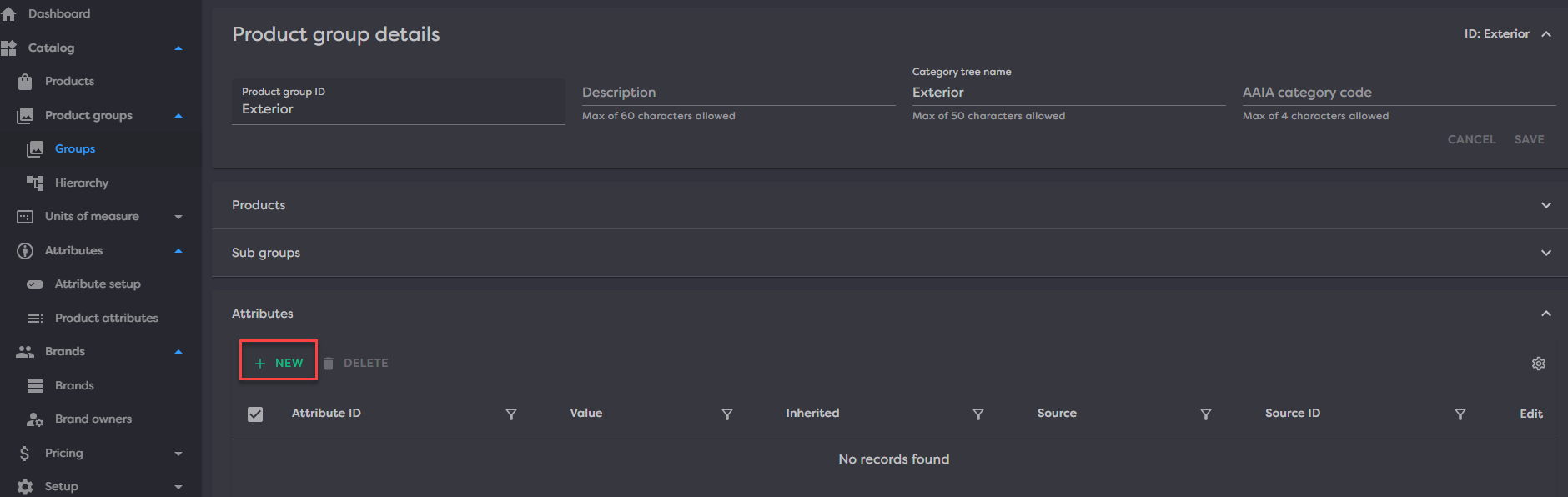 Once in the brand details page, expanding the Attributes expansion panel will display all the attributes on the current brand. Attributes can be created, edited and deleted from this grid.
