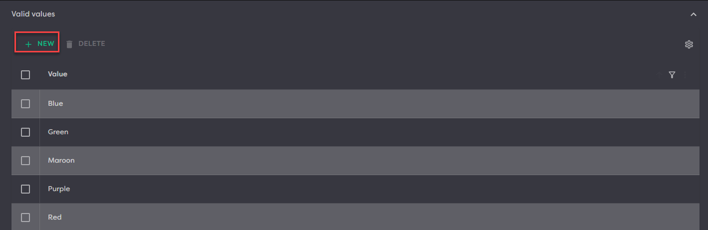 Valid values can be created and deleted within the grid.