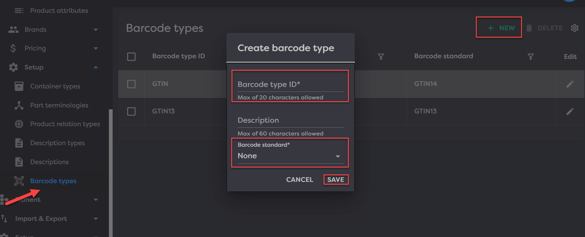 To set your barcode types navigate to them by going to Catalog>Setup>Barcode types. You can add a type by hitting NEW in the top right. Then Complete the required fields of barcode type ID and barcode standard and hit SAVE.