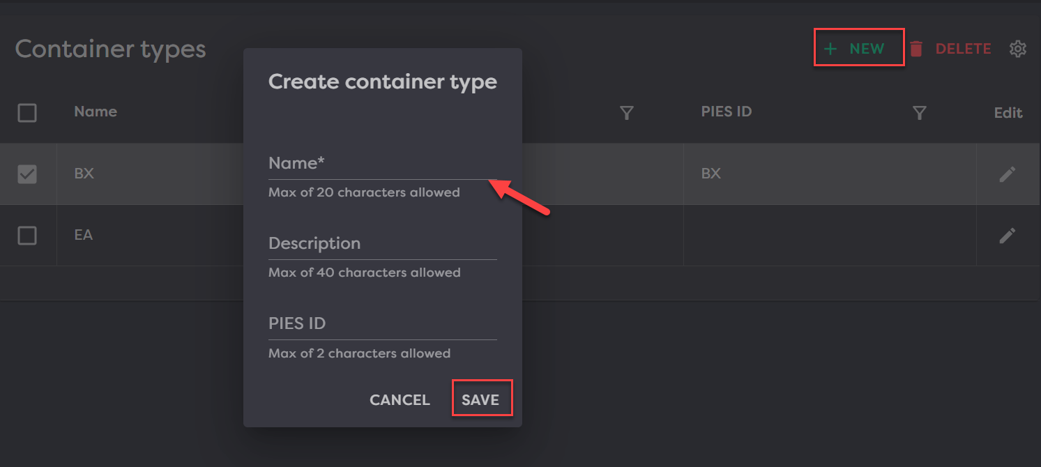 To create a container type, click New in the top right. Then complete the fields, only Name is required, then click Save.
