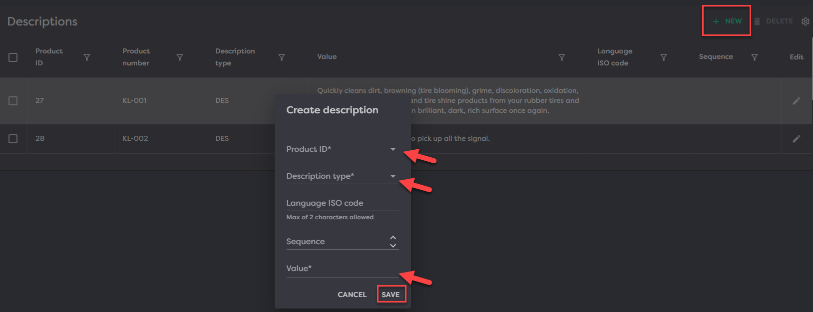 To add a new description to a product, click New in the top right, fill in the fields and Save.