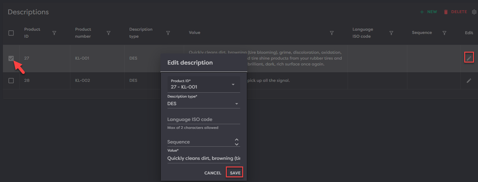 To edit an already existing description, checkmark the box in the first column of the product/description you want to edit and then click the pencil icon on the far right to open the edit modal. From here, edit the fields you desire and click Save.