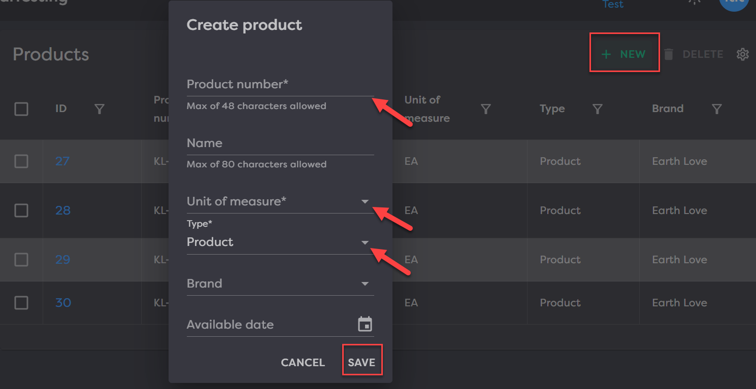 Add a product by clicking New in the top right. Complete the fields in the modal and click Save. The only required fields to create a product are: