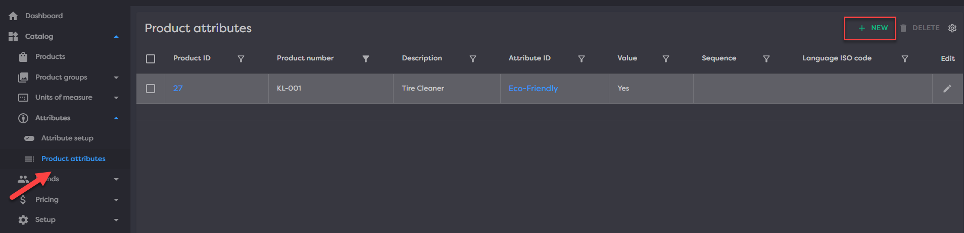 Product specific attributes can be configured by navigating to Catalog>Attributes>Product Attributes. This is where your attributes can be set directly onto products. It's important to note that an attribute setup must first be configured before an attribute can be associated with a product. At a minimum an attribute setup, a product and a value must all be defined to create an attribute value. You can assign a product attribute by clicking NEW in the top right.
