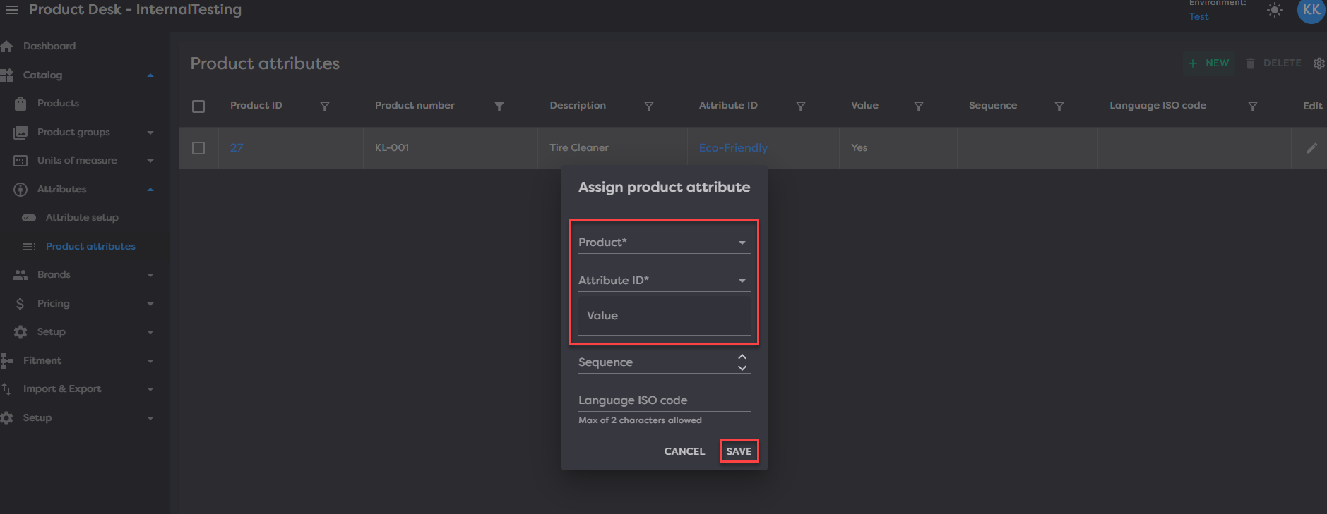 This will open a modal for you to pick the product you want to add an attribute to, select the attribute ID you will be adding to that product and assign the value for that.