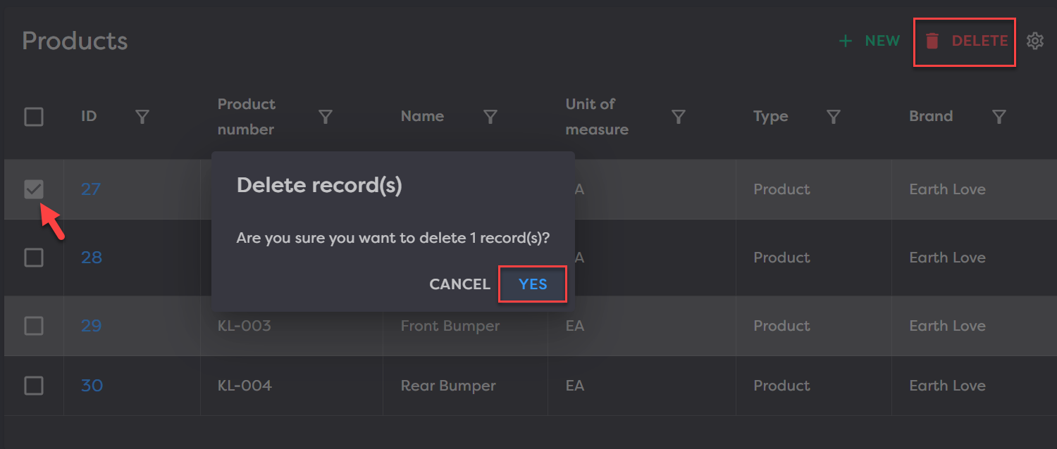 To delete, select a product or multiple products by clicking the checkbox in the first column and click Delete in the top right. Then confirm the delete by selecting Yes in the Delete Records modal.