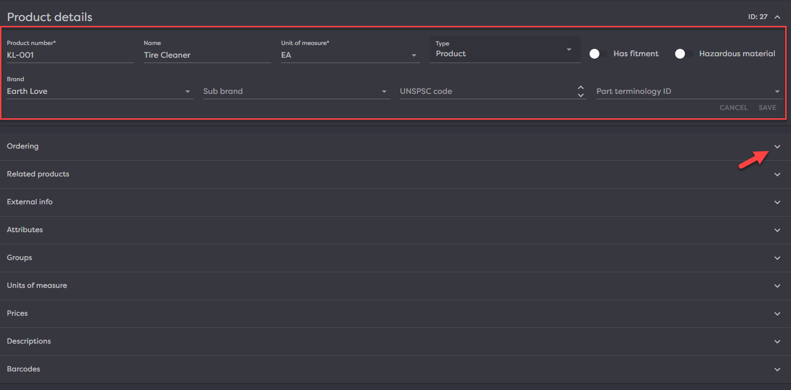 Once in a product, you have some information in the header and then several collapsed sections where you can add/edit information. Adding/editing information in the header will enable the Save/Cancel buttons. You must save after editing this area or your changes will be lost when you navigate away from the page.