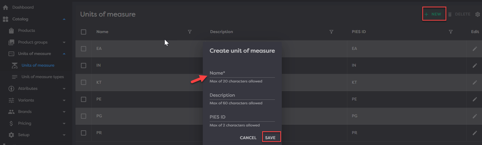 Navigate here by going to Catalog > Units of measure > Units of measure > click New in the top right. Then name your attribute to match how the data is structured. You may optionally add a description and the PIES two-letter ID if you would like.